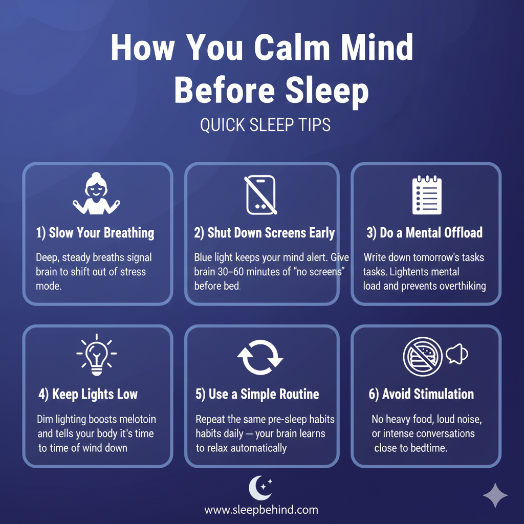 Struggling to unwind? Try simple breathing, journaling and routine hacks to sleep faster. How to calm mind before sleep at night in 7 easy steps.