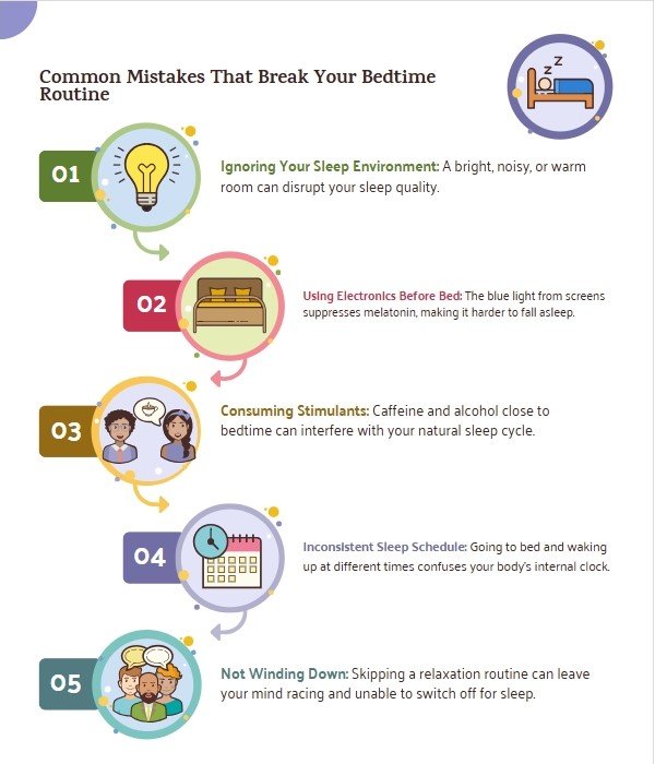 Relying on screens right before bed is the top mistake. Blue light tricks the brain into thinking it’s daytime and weakens the bedtime routine for better sleep.