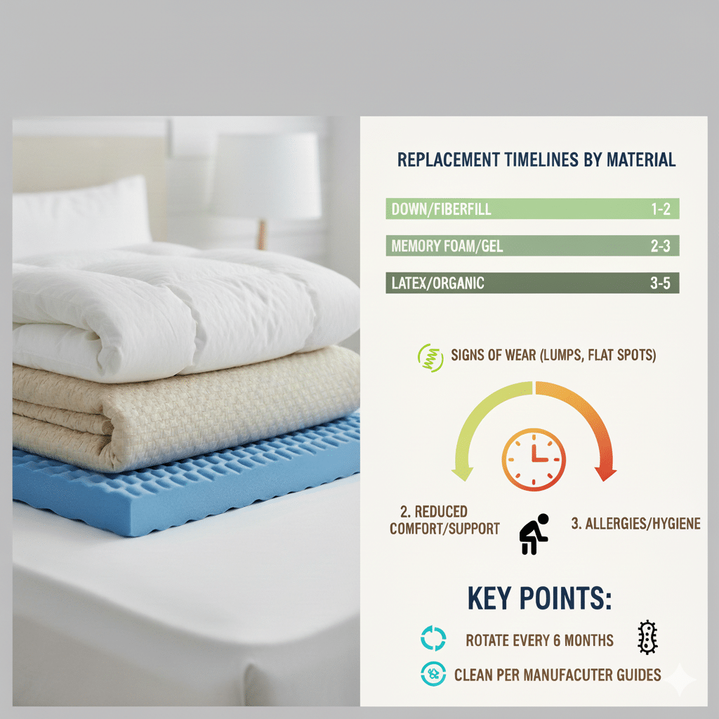 How often to replace mattress topper depends on material, thickness, and how you use it. Memory foam and latex toppers often last longer than down or fiber-fill toppers. Daily sleepers will replace toppers sooner than occasional users. Expect a typical lifespan of 2 to 5 years for most toppers, with high-quality latex sometimes reaching 7 years.